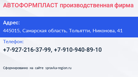 АВТОФОРМПЛАСТ, производственная фирма по адресу 445015, Самарская область, Тольятти, Никонова, 41 в дальнейшем Организация, размещена в следующих категориях: