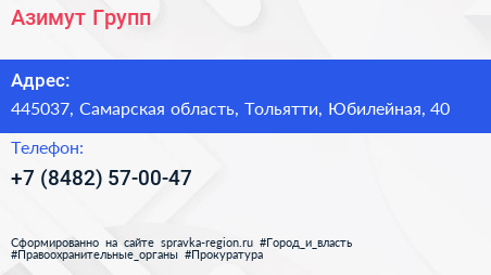 Азимут Групп по адресу 445037, Самарская область, Тольятти, Юбилейная, 40 в дальнейшем Организация, размещена в следующих категориях:
