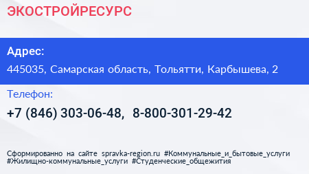 ЭКОСТРОЙРЕСУРС по адресу 445035, Самарская область, Тольятти, Карбышева, 2 в дальнейшем Организация, размещена в следующих категориях: