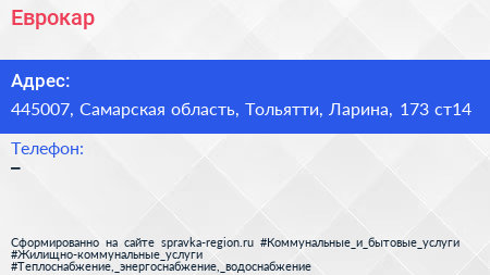 Еврокар по адресу 445007, Самарская область, Тольятти, Ларина, 173 ст14 в дальнейшем Организация, размещена в следующих категориях: