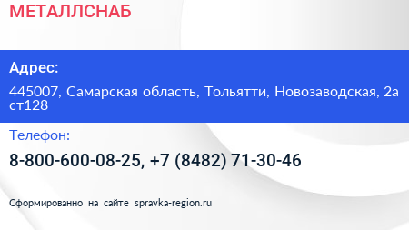 МЕТАЛЛСНАБ по адресу 445007, Самарская область, Тольятти, Новозаводская, 2а ст128 в дальнейшем Организация, размещена в следующих категориях: