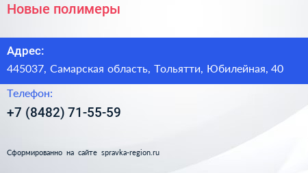 Новые полимеры по адресу 445037, Самарская область, Тольятти, Юбилейная, 40 в дальнейшем Организация, размещена в следующих категориях: