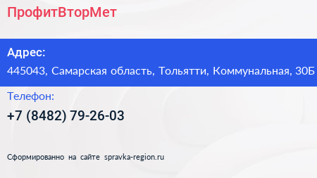 ПрофитВторМет по адресу 445043, Самарская область, Тольятти, Коммунальная, 30Б в дальнейшем Организация, размещена в следующих категориях: