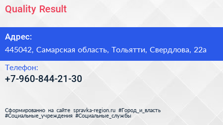 Quality Result по адресу 445042, Самарская область, Тольятти, Свердлова, 22а в дальнейшем Организация, размещена в следующих категориях: