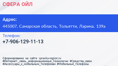 СФЕРА-ОЙЛ по адресу 445007, Самарская область, Тольятти, Ларина, 139а в дальнейшем Организация, размещена в следующих категориях: