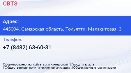 СВТЗ по адресу 445004, Самарская область, Тольятти, Малахитовая, 3 в дальнейшем Организация, размещена в следующих категориях: