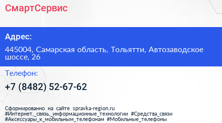 СмартСервис по адресу 445004, Самарская область, Тольятти, Автозаводское шоссе, 26 в дальнейшем Организация, размещена в следующих категориях: