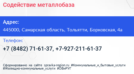 Содействие, металлобаза по адресу 445000, Самарская область, Тольятти, Борковская, 4а в дальнейшем Организация, размещена в следующих категориях: