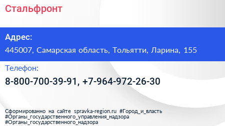 Стальфронт по адресу 445007, Самарская область, Тольятти, Ларина, 155 в дальнейшем Организация, размещена в следующих категориях: