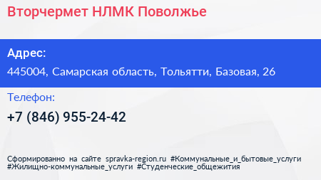 Вторчермет НЛМК Поволжье по адресу 445004, Самарская область, Тольятти, Базовая, 26 в дальнейшем Организация, размещена в следующих категориях: