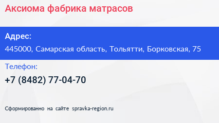 Аксиома, фабрика матрасов по адресу 445000, Самарская область, Тольятти, Борковская, 75 в дальнейшем Организация, размещена в следующих категориях: