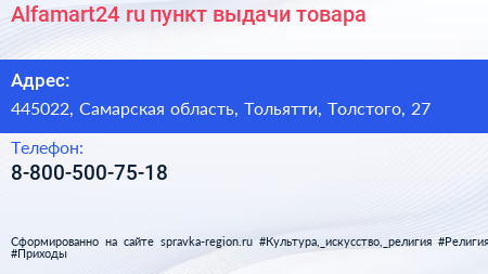 Alfamart24.ru, пункт выдачи товара по адресу 445022, Самарская область, Тольятти, Толстого, 27 в дальнейшем Организация, размещена в следующих категориях: