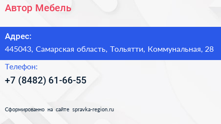 Автор Мебель по адресу 445043, Самарская область, Тольятти, Коммунальная, 28 в дальнейшем Организация, размещена в следующих категориях: