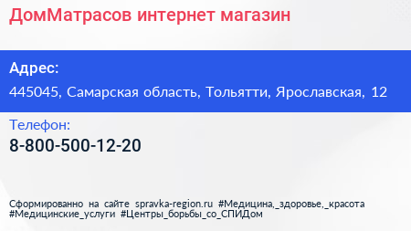 ДомМатрасов, интернет-магазин по адресу 445045, Самарская область, Тольятти, Ярославская, 12 в дальнейшем Организация, размещена в следующих категориях: