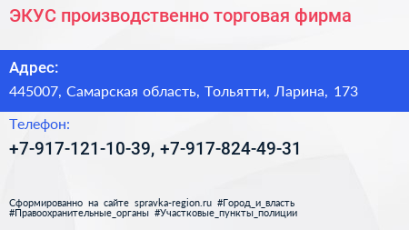 ЭКУС, производственно-торговая фирма по адресу 445007, Самарская область, Тольятти, Ларина, 173 в дальнейшем Организация, размещена в следующих категориях: