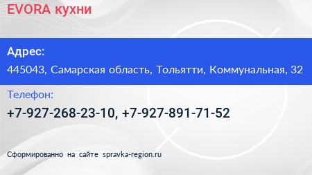 EVORA кухни по адресу 445043, Самарская область, Тольятти, Коммунальная, 32 в дальнейшем Организация, размещена в следующих категориях:
