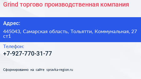 Grind, торгово-производственная компания по адресу 445043, Самарская область, Тольятти, Коммунальная, 27 ст1 в дальнейшем Организация, размещена в следующих категориях: