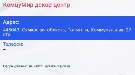 КомцуМир, декор-центр по адресу 445043, Самарская область, Тольятти, Коммунальная, 27 ст2 в дальнейшем Организация, размещена в следующих категориях: