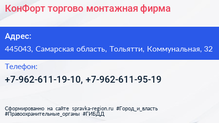 КонФорт, торгово-монтажная фирма по адресу 445043, Самарская область, Тольятти, Коммунальная, 32 в дальнейшем Организация, размещена в следующих категориях: