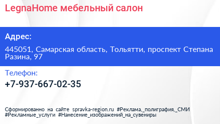 LegnaHome, мебельный салон по адресу 445051, Самарская область, Тольятти, проспект Степана Разина, 97 в дальнейшем Организация, размещена в следующих категориях: