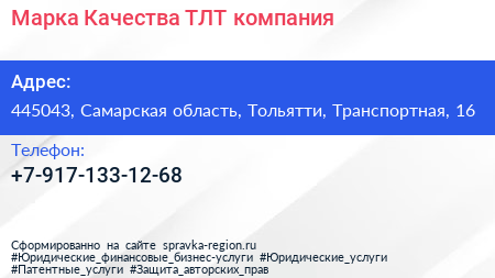 Марка Качества ТЛТ, компания по адресу 445043, Самарская область, Тольятти, Транспортная, 16 в дальнейшем Организация, размещена в следующих категориях: