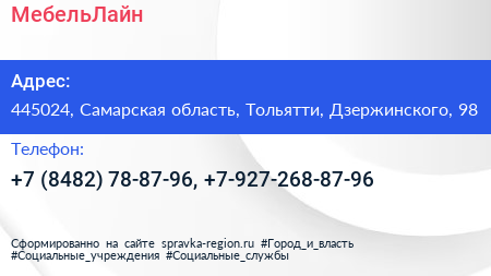 МебельЛайн по адресу 445024, Самарская область, Тольятти, Дзержинского, 98 в дальнейшем Организация, размещена в следующих категориях: