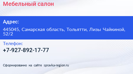 Мебельный салон по адресу 445045, Самарская область, Тольятти, Лизы Чайкиной, 52/2 в дальнейшем Организация, размещена в следующих категориях:
