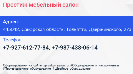 Престиж, мебельный салон по адресу 445042, Самарская область, Тольятти, Дзержинского, 27а в дальнейшем Организация, размещена в следующих категориях: