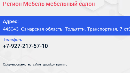 Регион-Мебель, мебельный салон по адресу 445043, Самарская область, Тольятти, Транспортная, 7 ст9 в дальнейшем Организация, размещена в следующих категориях: