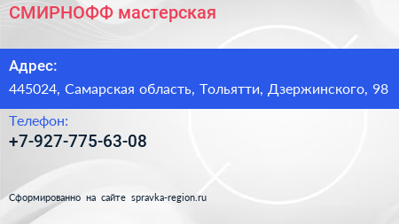 СМИРНОФФ, мастерская по адресу 445024, Самарская область, Тольятти, Дзержинского, 98 в дальнейшем Организация, размещена в следующих категориях: