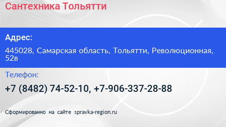 Сантехника Тольятти по адресу 445028, Самарская область, Тольятти, Революционная, 52в в дальнейшем Организация, размещена в следующих категориях: