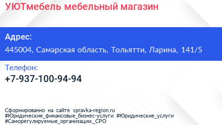 УЮТмебель, мебельный магазин по адресу 445004, Самарская область, Тольятти, Ларина, 141/5 в дальнейшем Организация, размещена в следующих категориях: