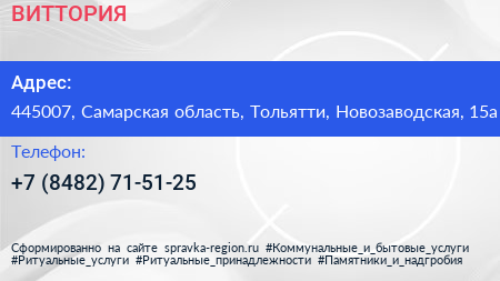 ВИТТОРИЯ по адресу 445007, Самарская область, Тольятти, Новозаводская, 15а в дальнейшем Организация, размещена в следующих категориях: