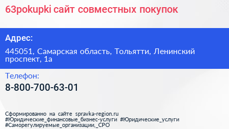 63pokupki, сайт совместных покупок по адресу 445051, Самарская область, Тольятти, Ленинский проспект, 1а в дальнейшем Организация, размещена в следующих категориях: