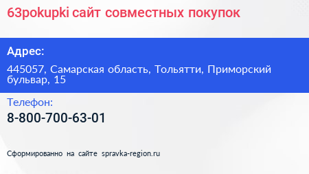 63pokupki, сайт совместных покупок по адресу 445057, Самарская область, Тольятти, Приморский бульвар, 15 в дальнейшем Организация, размещена в следующих категориях: