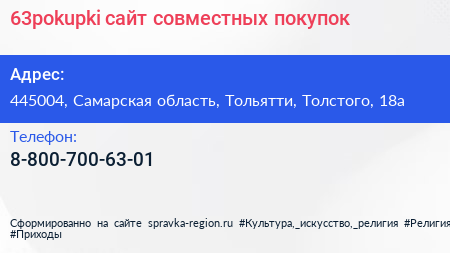 63pokupki, сайт совместных покупок по адресу 445004, Самарская область, Тольятти, Толстого, 18а в дальнейшем Организация, размещена в следующих категориях: