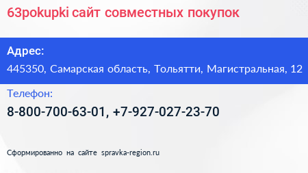 63pokupki, сайт совместных покупок по адресу 445350, Самарская область, Тольятти, Магистральная, 12 в дальнейшем Организация, размещена в следующих категориях: