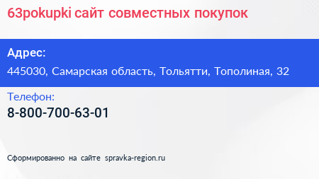 63pokupki, сайт совместных покупок по адресу 445030, Самарская область, Тольятти, Тополиная, 32 в дальнейшем Организация, размещена в следующих категориях: