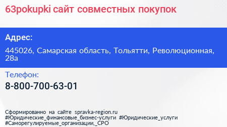 63pokupki, сайт совместных покупок по адресу 445026, Самарская область, Тольятти, Революционная, 28а в дальнейшем Организация, размещена в следующих категориях: