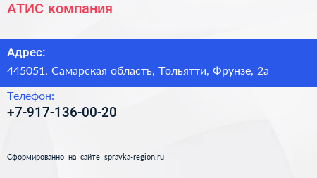 АТИС, компания по адресу 445051, Самарская область, Тольятти, Фрунзе, 2а в дальнейшем Организация, размещена в следующих категориях: