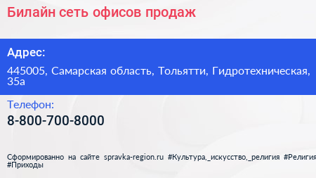 Билайн, сеть офисов продаж по адресу 445005, Самарская область, Тольятти, Гидротехническая, 35а в дальнейшем Организация, размещена в следующих категориях: