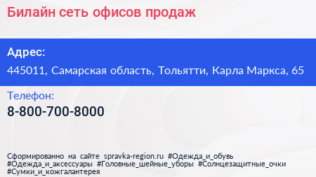 Билайн, сеть офисов продаж по адресу 445011, Самарская область, Тольятти, Карла Маркса, 65 в дальнейшем Организация, размещена в следующих категориях: