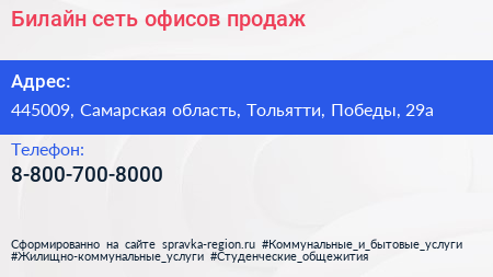 Билайн, сеть офисов продаж по адресу 445009, Самарская область, Тольятти, Победы, 29а в дальнейшем Организация, размещена в следующих категориях: