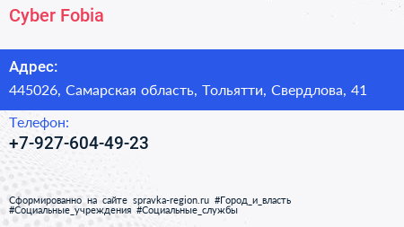 Cyber Fobia по адресу 445026, Самарская область, Тольятти, Свердлова, 41 в дальнейшем Организация, размещена в следующих категориях: