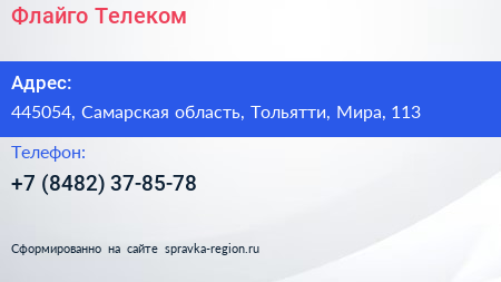 Флайго Телеком по адресу 445054, Самарская область, Тольятти, Мира, 113 в дальнейшем Организация, размещена в следующих категориях: