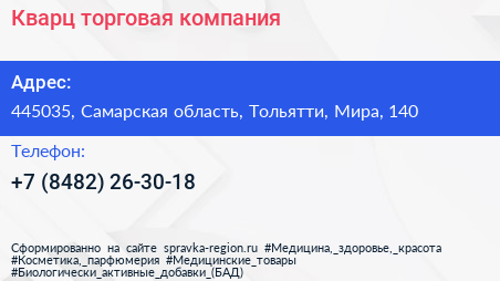 Кварц, торговая компания по адресу 445035, Самарская область, Тольятти, Мира, 140 в дальнейшем Организация, размещена в следующих категориях: