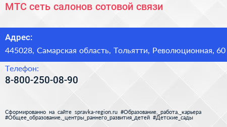 МТС, сеть салонов сотовой связи по адресу 445028, Самарская область, Тольятти, Революционная, 60 в дальнейшем Организация, размещена в следующих категориях: