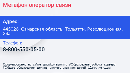 Мегафон, оператор связи по адресу 445026, Самарская область, Тольятти, Революционная, 28а в дальнейшем Организация, размещена в следующих категориях: