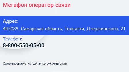 Мегафон, оператор связи по адресу 445039, Самарская область, Тольятти, Дзержинского, 21 в дальнейшем Организация, размещена в следующих категориях: