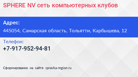 SPHERE NV, сеть компьютерных клубов по адресу 445054, Самарская область, Тольятти, Карбышева, 12 в дальнейшем Организация, размещена в следующих категориях: